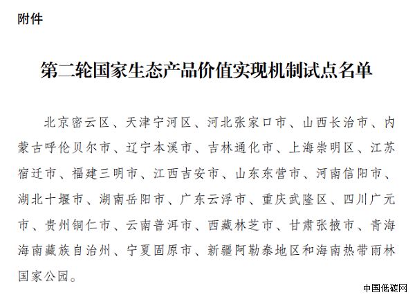 为深入贯彻党的二十大和二十届历次全会精神,认真落实党中央、国务院决策部署,加快推进中共中央办公厅、国务院办公厅《关于建立健全生态产品价值实现机制的意见》重点任务落实,经部门推荐、征求地方意见等程序,确定北京市密云区等25个地区和海南热带雨林国家公园为第二轮国家生态产品价值实现机制试点,试点期限为2026-2028年。现将第二轮试点名单予以公布,并就有关事项通知如下: