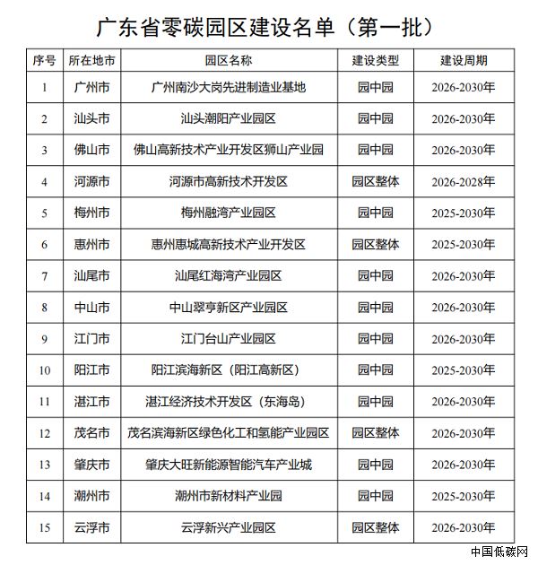 按照《广东省发展改革委 广东省工业和信息化厅 广东省生态环境厅 广东省能源局关于印发〈广东省零碳园区建设方案〉的通知》(粤发改资环函〔2025〕2054号)要求,经园区申报、地市推荐、专家评审、部门联审等程序,确定了广东省零碳园区建设名单(第一批),共纳入15个园区(以下简称“省级零碳园区”)。现予公布,并就有关事项通知如下: